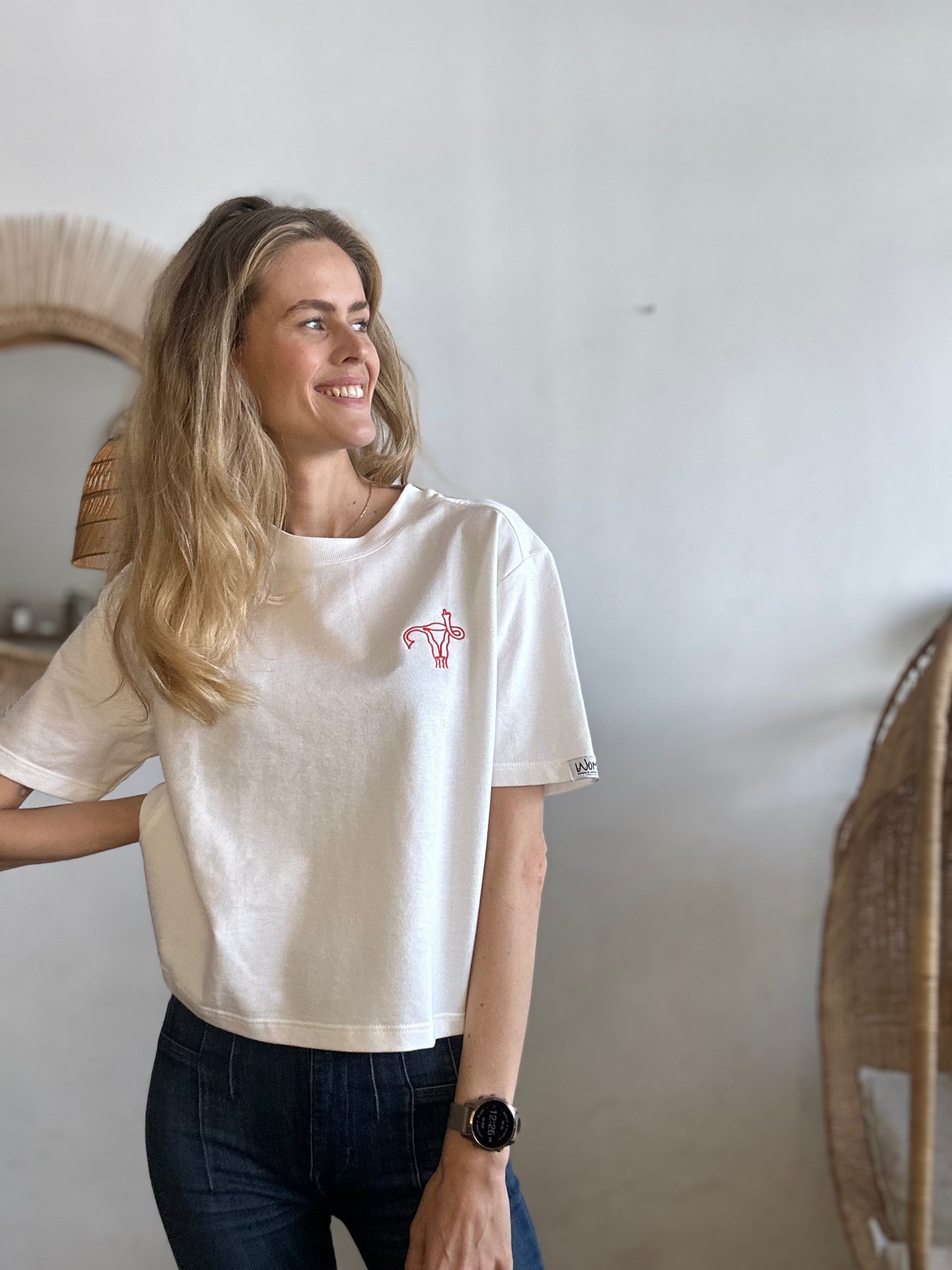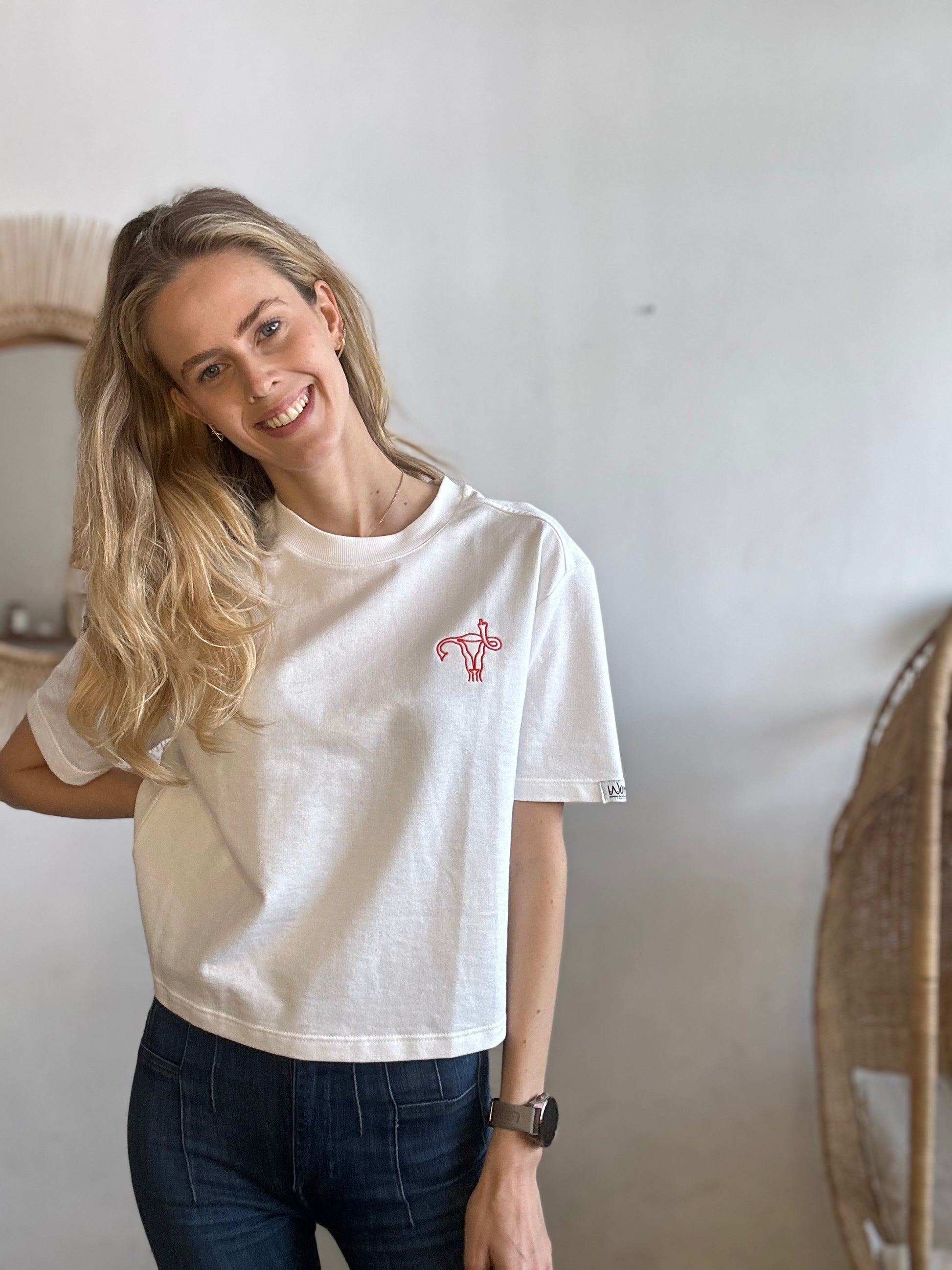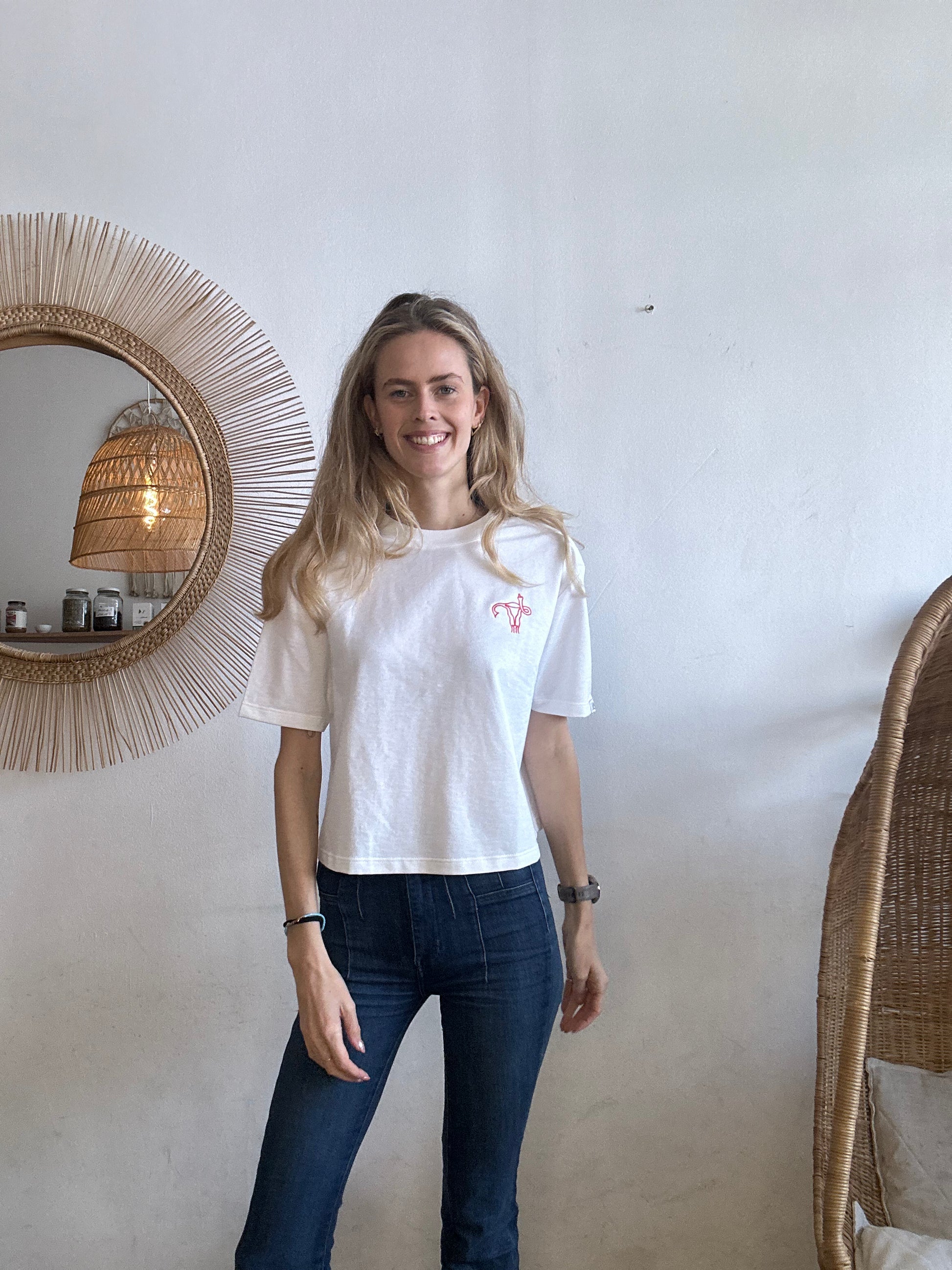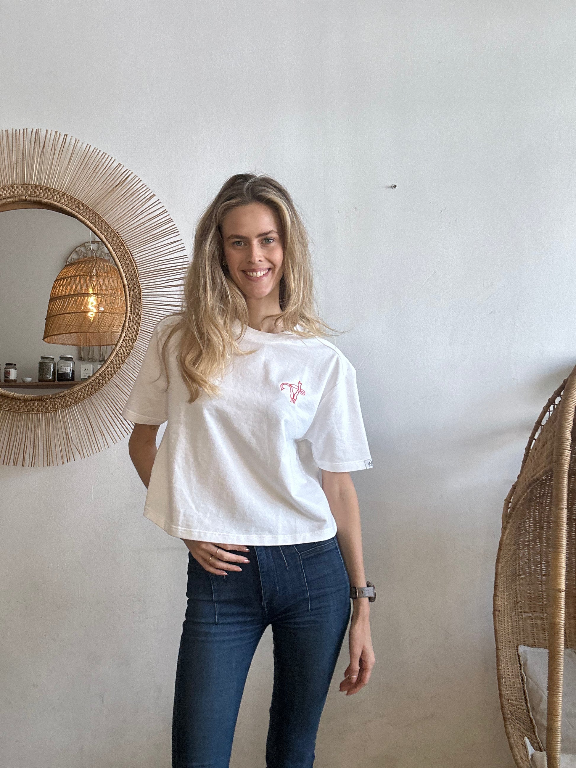 A slightly cropped boxy shirt made from a heavier, thicker organic cotton. Great with high-waisted pants.